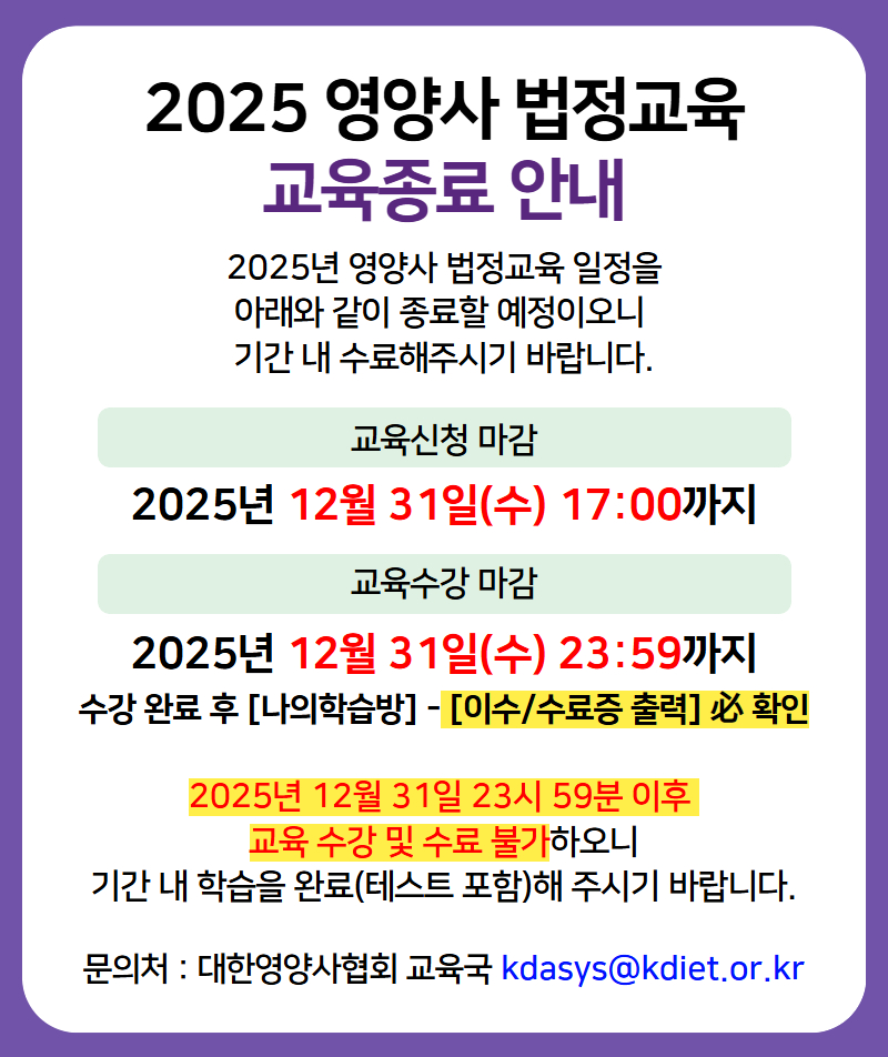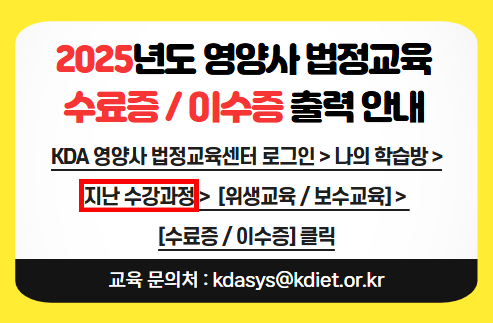 | 공지 [집합교육 일정] 2025 영양사 식품위생교육 집합교육 일정 안내 | 2025-03-28 |