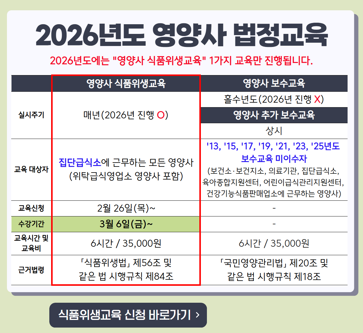 | 공지 [집합교육 일정] 2026 영양사 식품위생교육 집합교육 일정 안내 | 2026-02-25 |
